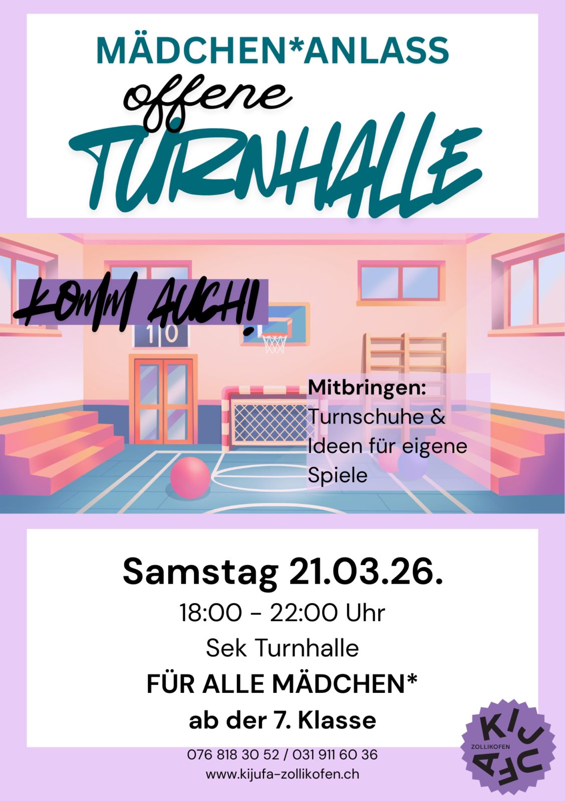 Der Anlass ist ab 18:00 bis 22:00 Uhr für alle Mädchen* ab der 7. Klasse. Pack deine Turnschuhe ein und mach mit! Du kannst dir auch gerne einige Spiele überlegen.